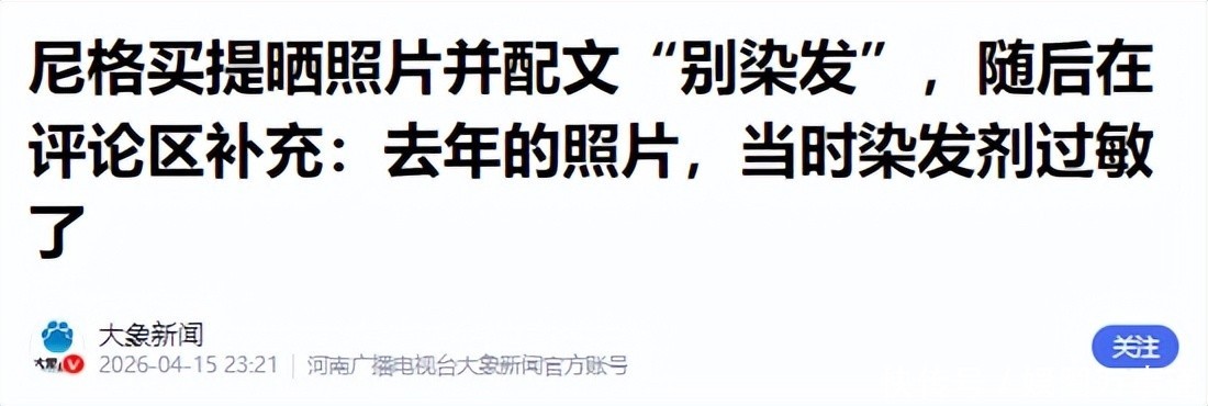1.尼格买提晒照片并配文“别染发”,随后在评论区补充:去年的照片,当时染发剂过敏了——大象新闻